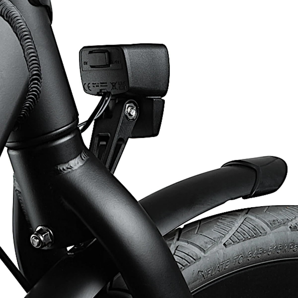 With clean lines and an angular design, the small NXT 60s Dynamo LED headlight from AXA is a welcome change from typically round lights. It looks good on modern city, trekking or fitness bikes. With the bracket, the bright e-bike front light can be screwed onto a rigid fork head or suspension fork bridge with a through hole. A front reflector is also integrated under the lamp housing to ensure complete road suitability.