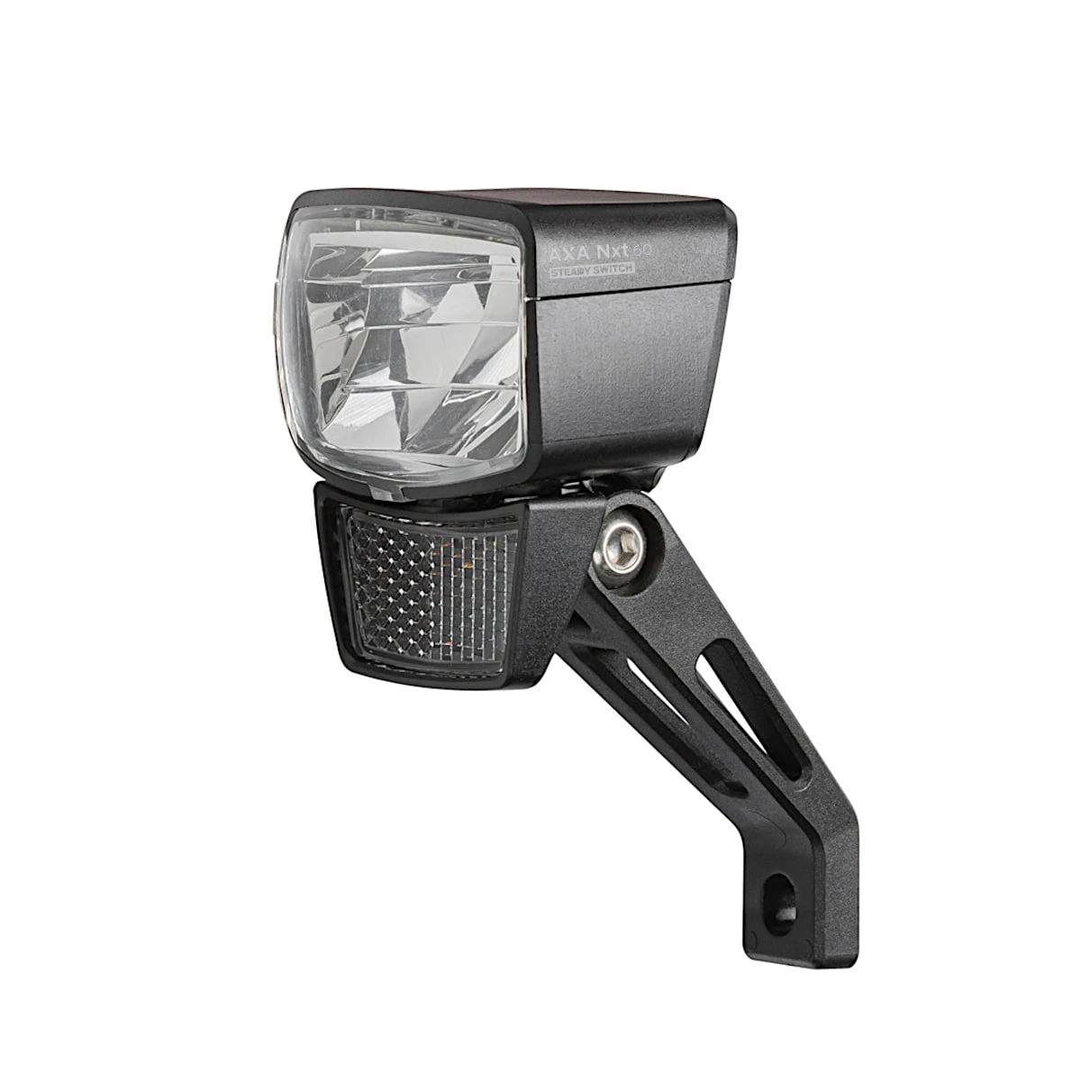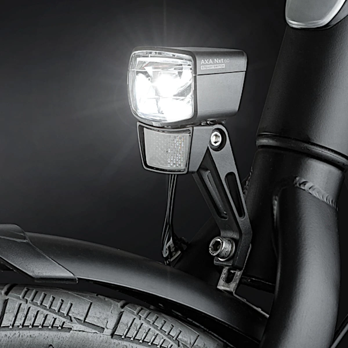 Powered by a side-wheel dynamo or hub dynamo, the AXA NXT 60 front light illuminates the route with a wide beam that is also visible to other road users from a distance. With good close-range illumination, nothing remains hidden, even far ahead when you are cycling fast. The Steady Light function is an additional safety feature which activates a light when the bike is stopped for up to 4 minutes if the dynamo is not in use.