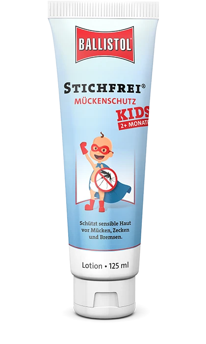 The Stichfrei Kids insect repellent protects you up to 4 hours from mosquitoes, ticks and gadflies.