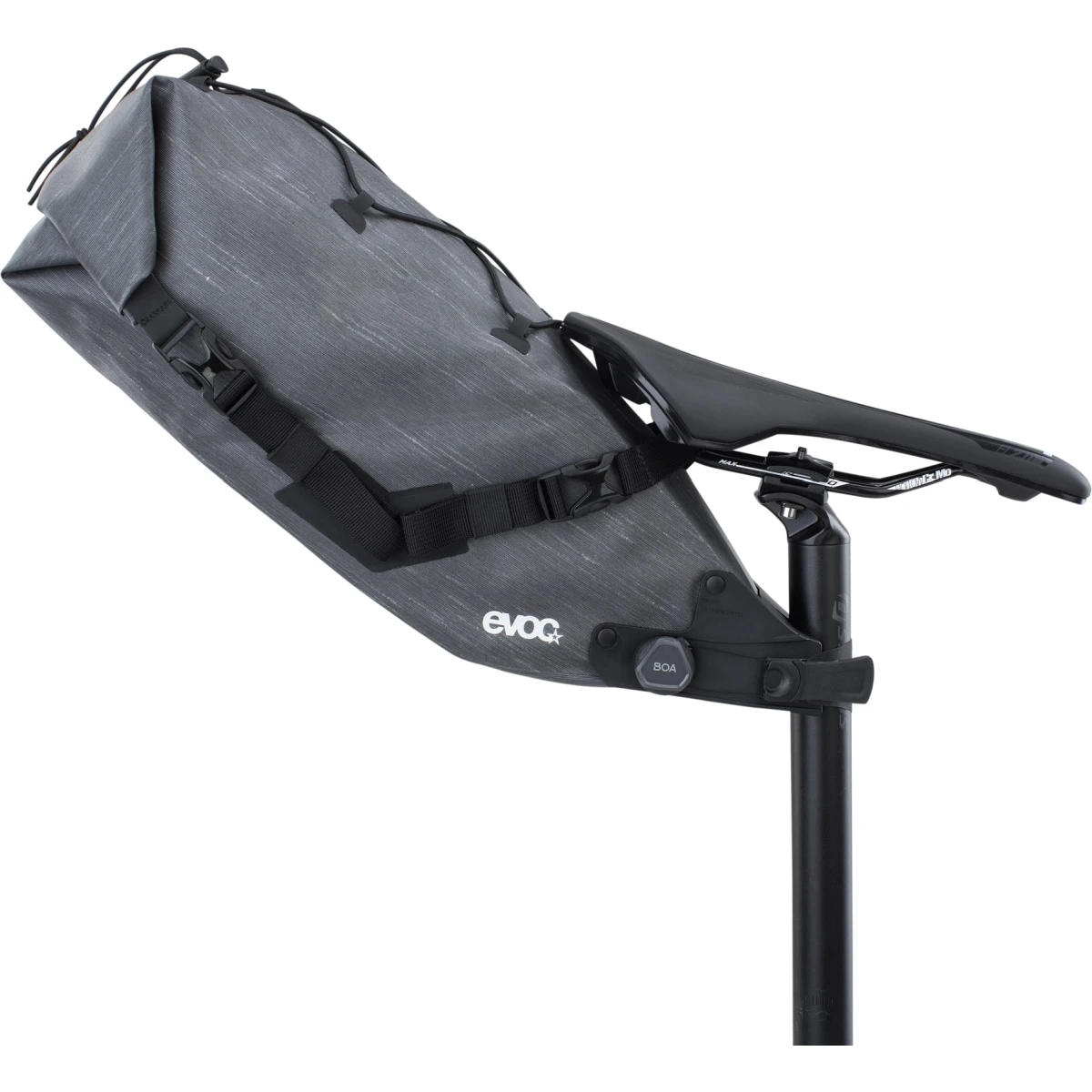 The SEAT PACK BOA WP 8 from EVOC provides plenty of storage space behind the saddle for your bike adventures with a road, gravel or mountain bike. Thanks to the roll-up bag opening and compression strap, the pack volume is flexible. Your equipment is in good hands packed into the practical saddle bag, as the material, the taped seams and the roll closure make the bag absolutely waterproof.