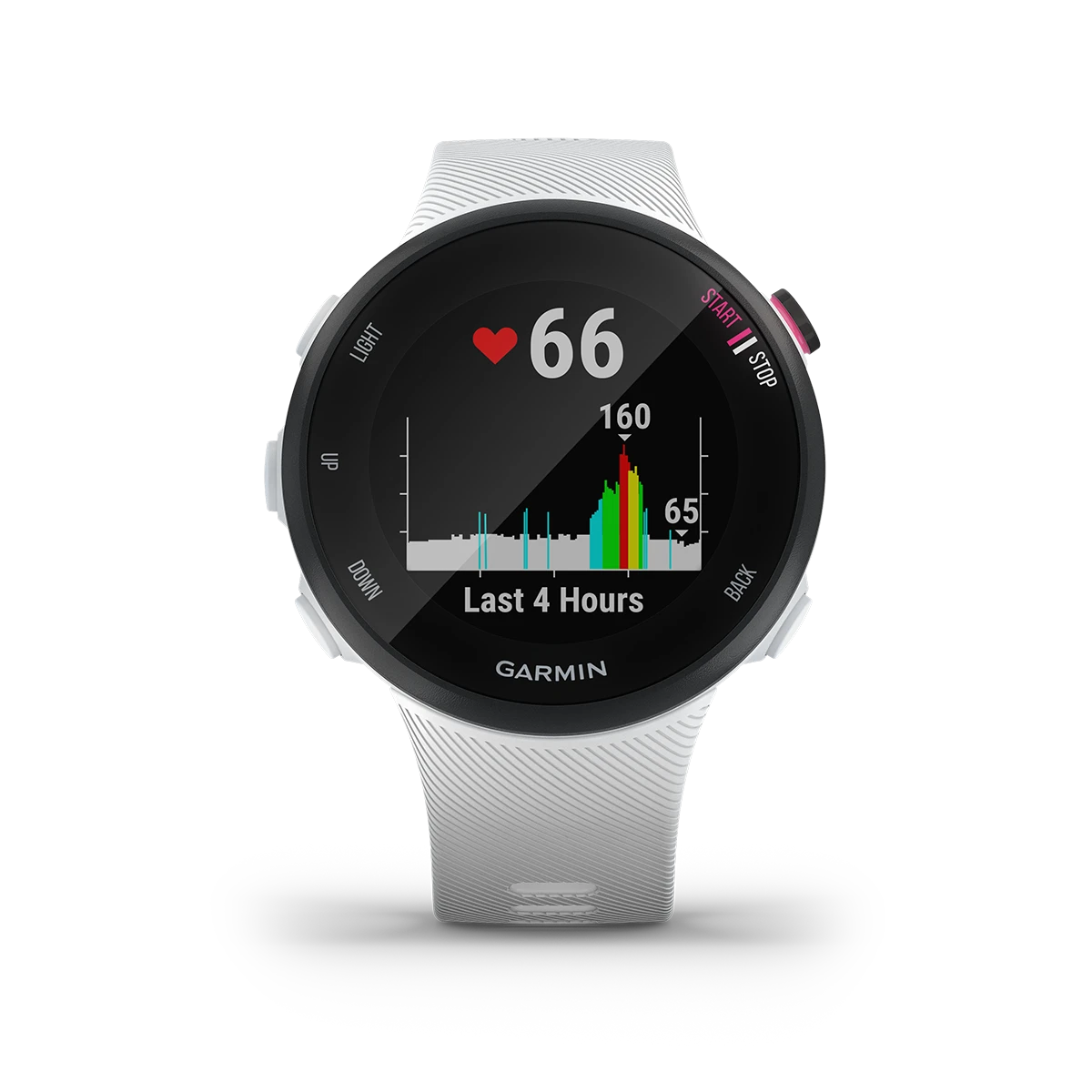 As a successor of the Forerunner 35, the FR45 with its round design was adapted to the noble look of the more high-grade Forerunner models and comes of course with all important running features, such as distance, pace, intervals and VO2max estimate. Thanks to Elevate™ technology, your heart rate is measured directly at your wrist, which means you don’t need a separate chest strap.