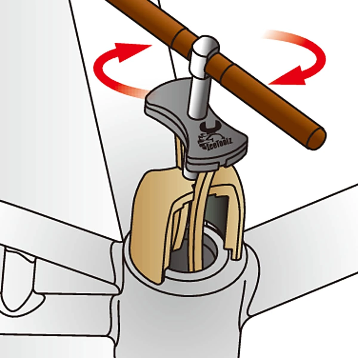 Press fit bottom brackets and press fit ball bearings on the crank arm spindle may be removed with the Xpert bearing puller by IceToolz. The two rotatable gripper arms firmly grip bearing cups and integrated bearings from the inside, and axle bearings from the outside. The tool accepts press caps, bearings and axles up to 45 millimetres.