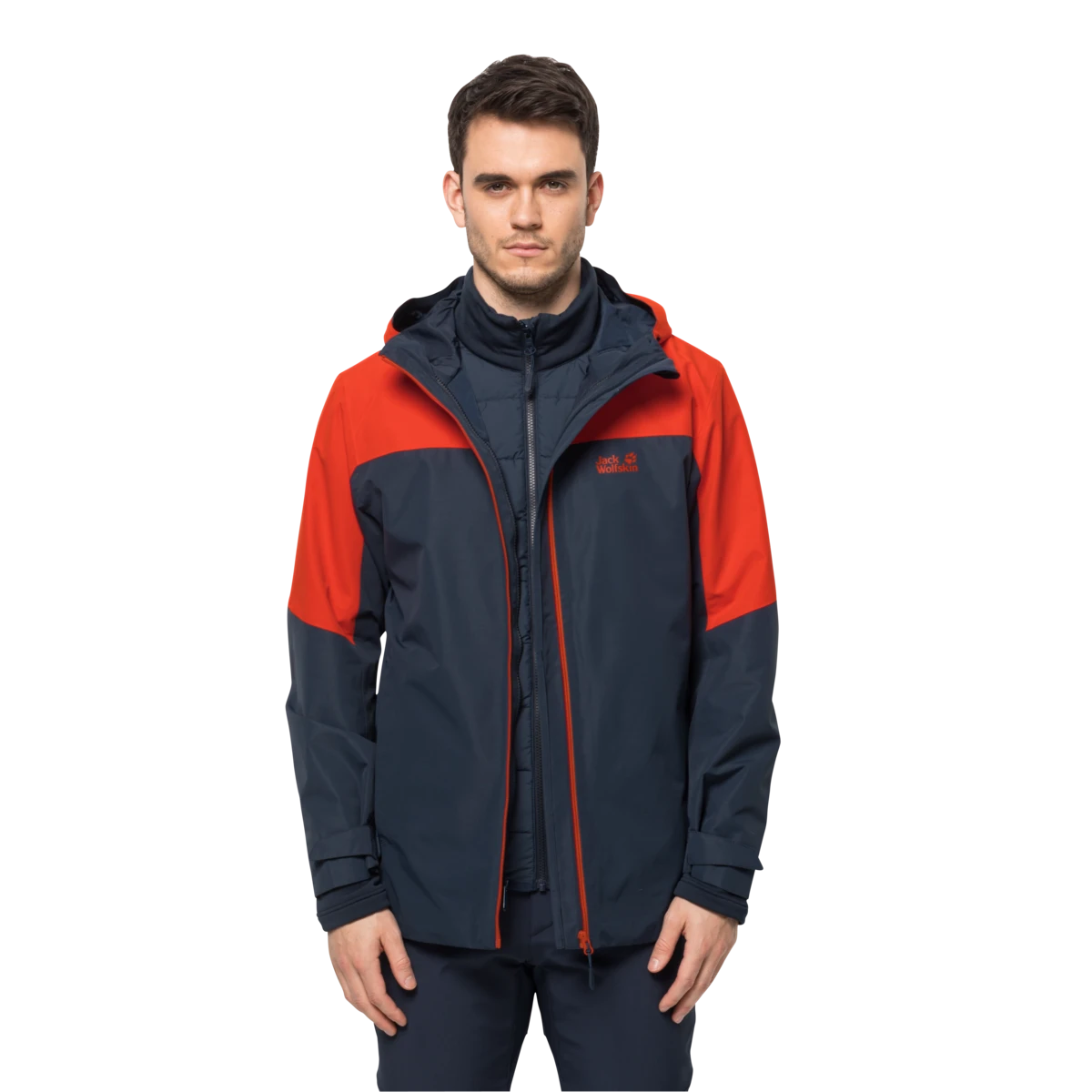 The GLAABACH 3IN1 JKT M by Jack Wolfskin is a men’s rain jacket. It comes with a removable hybrid inner jacket made from warming and windproof TEXASHIELD SOFTTOUCH with TEXATHERM CORE ECOSPHERE insulation to perfectly protect you in bad weather. The outer jacket keeps off wind and rain, thanks to its TEXAPORE CORE SOFT TASLAN 2L membrane. What’s more, it also offers a grown-on and adjustable hood and water-repellent zips. With this versatile, wind- and waterproof 3-in-1 outdoor jacket, in-between seasons and the cool season can be truly enjoyed.