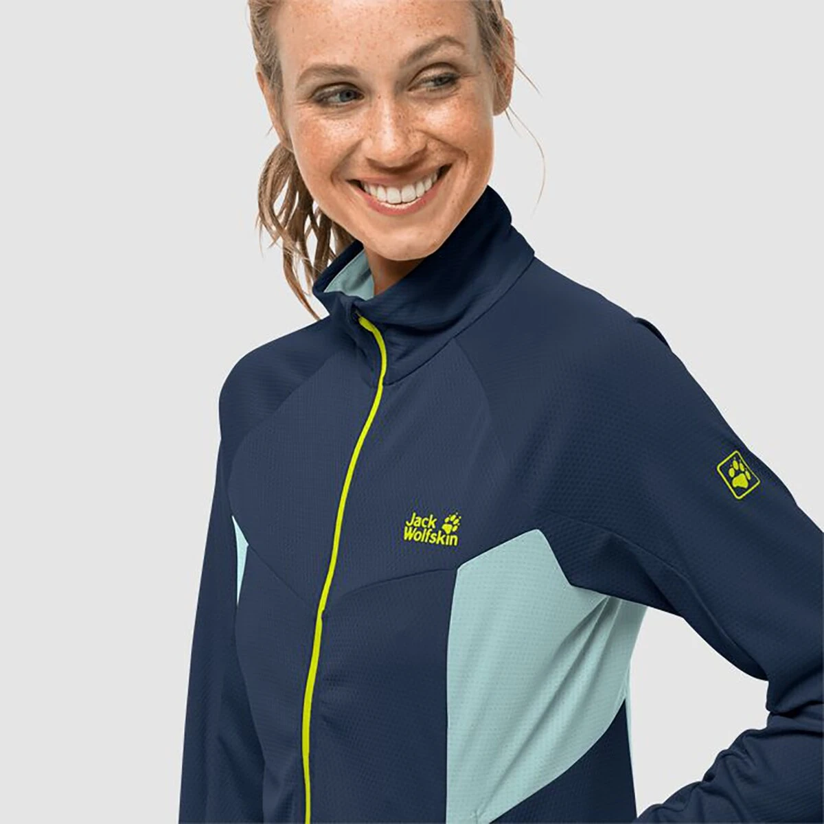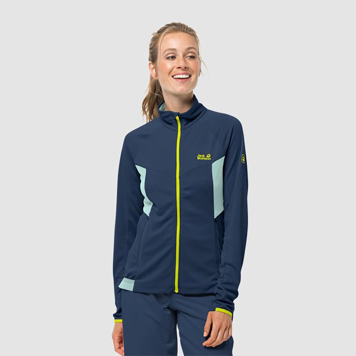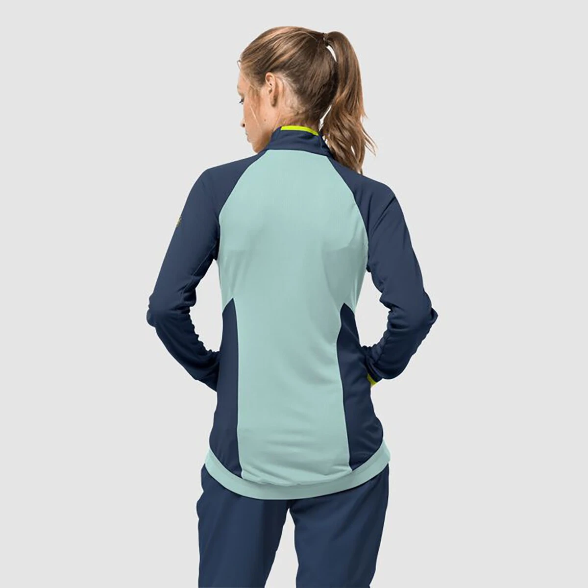 The fleece GRADIENT Jacket W for women from Jack Wolfskin ensures freedom of movement and a comfortable temperature on your bike tours. The jacket is ideal as a light layer in cool temperatures or as a middle layer under a rain jacket.