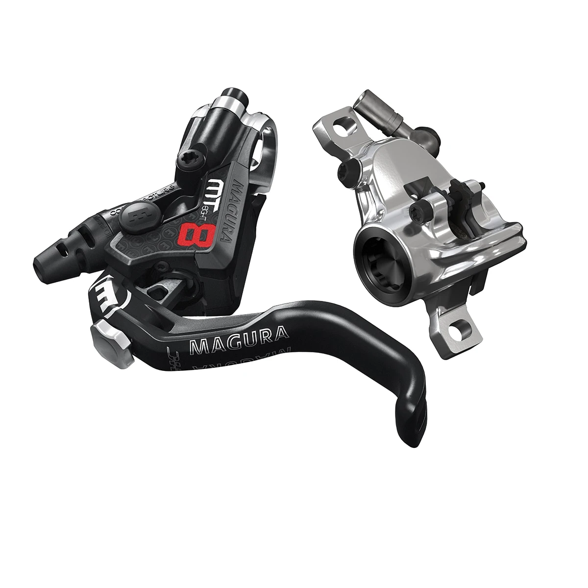 Carrying the genes of its big sister MT8 SL, Magura’s MT8 Pro offers the same braking performance as the high-end model. The high-performance brake for cross-country use is characterized by high reliability on tours and in competitions, and impresses with a low weight. This is thanks to the robust Carbotecture® SL brake bracket with ergonomic 1-finger aluminium HC brake lever and the one-part forged two-piston brake caliper. The elegant, polished chrome finish of the brake caliper makes sure the Magura MT8 Pro also impresses in terms of design.