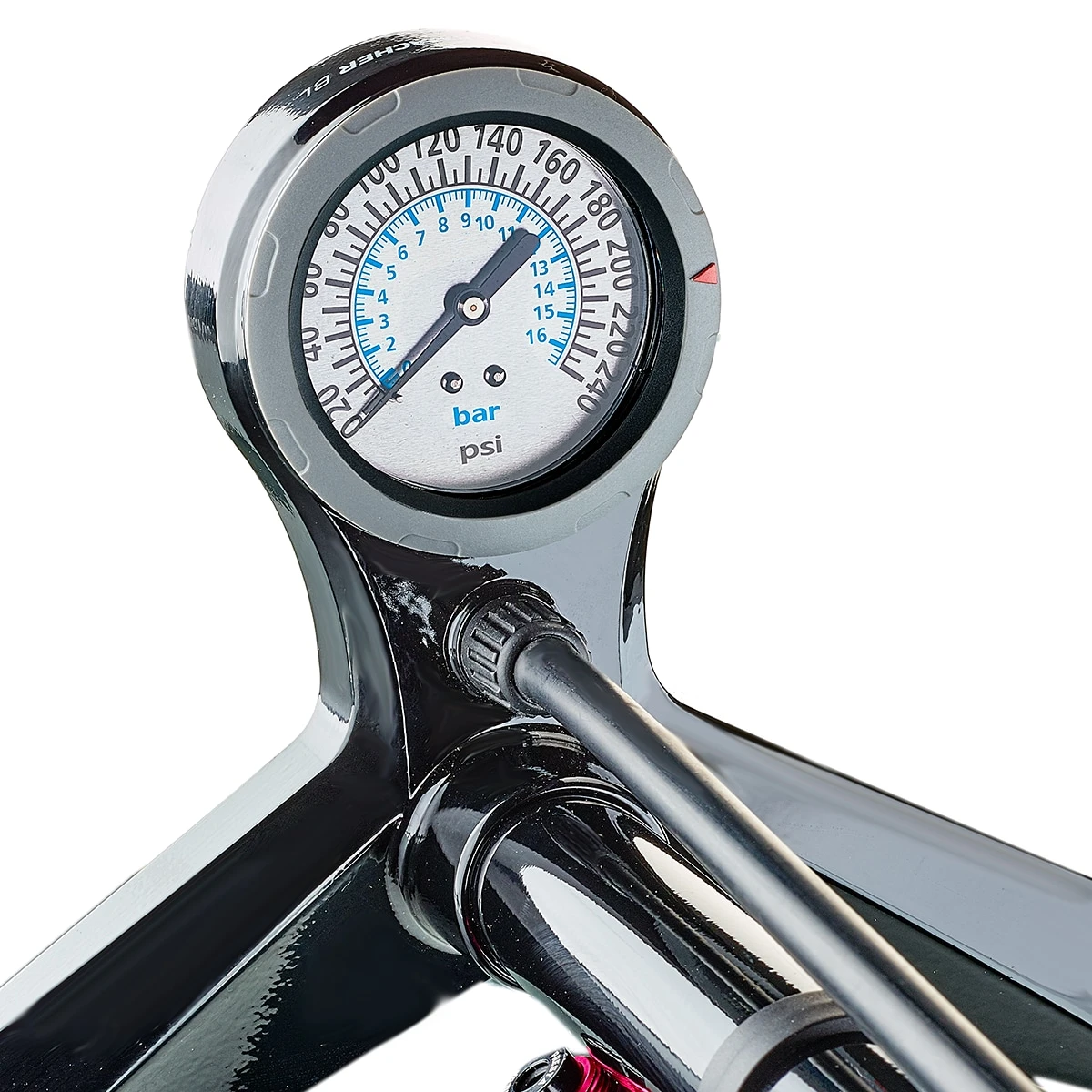 Verdict (translated from German): “Pumps very well and effectively, shows pressure when plugged in and has a drain knob for fine adjustment. The aluminium lever on the head inspires confidence. The wooden handle sits well in the hand. Stable and inexpensive. However the pressure gauge could be easier to read.” (translated from German)