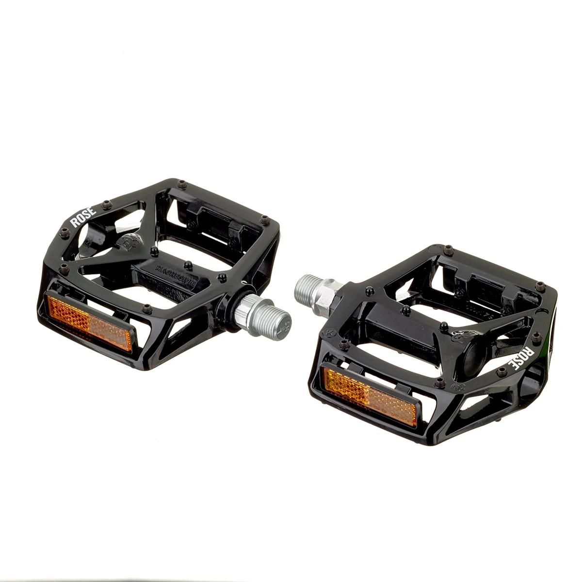 Black, powerful and fast like a panther, the Pro Magnesium pedal by ROSE hits the trail. Featuring a wide platform and nine pins on each side, the pedals reliably grip your shoes, so that you can easily master rough downhills and rocky 180° bends. The screw steel pins can even easily be adjusted in height after dirty rides over dusty tracks and through waterholes with a hex wrench.