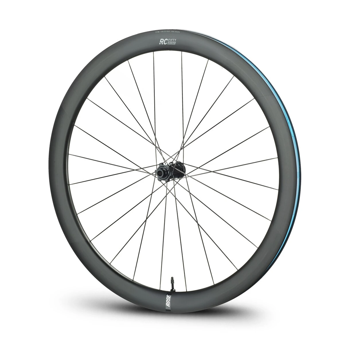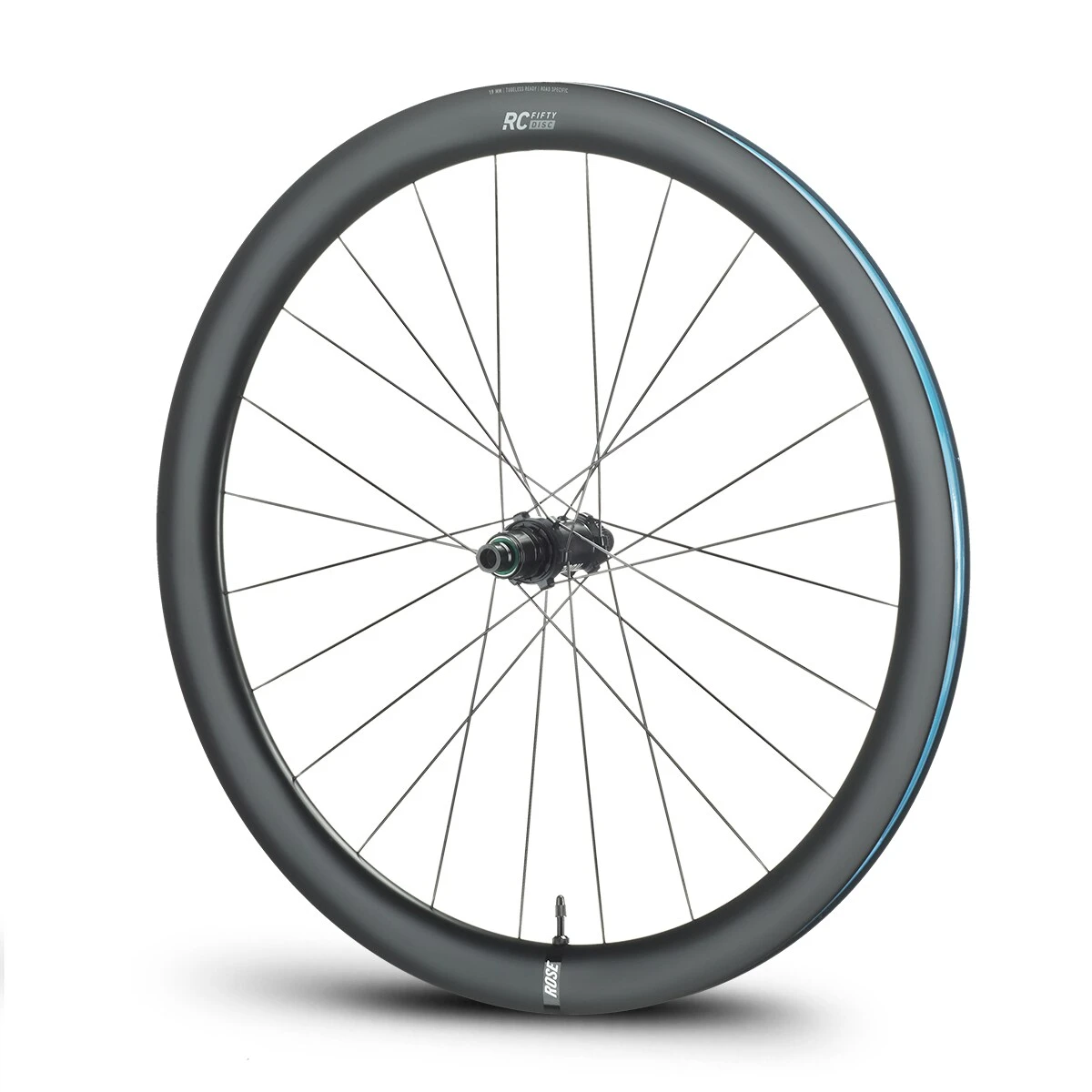 The elegant carbon rims of the ROSE RC-Fifty Disc road bike wheelset were developed completely in-house and have a special construction that makes them very light and yet stable and resistant. Of course, we follow the trend towards wider tyres and therefore gave the rim a full inner width of 19 mm and “tubeless-ready” compatibility – no upgrades needed. You can also ride the RC-Fifty carbon wheels of course in a conventional way with conventional tyres and inner tubes.