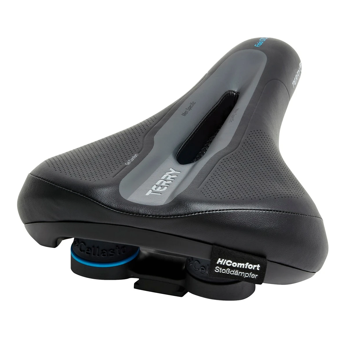 Compared to the Fisio GTC Gel saddle (prod. code: 2203957), the Fisio GTC Gel Max Men Touring Comfort saddle by Terry comes with a 3 cm wider seat with gel padding and shock-absorbing Cellasto damping system for best riding comfort on longer tours. Your back is relieved thanks to a riding position that is only slightly bent. As additional feature, this handmade saddle offers a practical QuickClick mount for Terry and Topeak saddle bags.