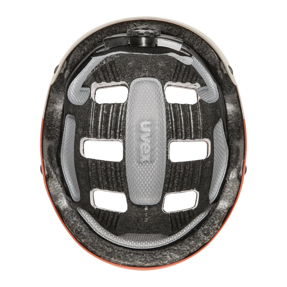 A width-adjustable half ring for individual adjustment of the helmet to the head measurements.