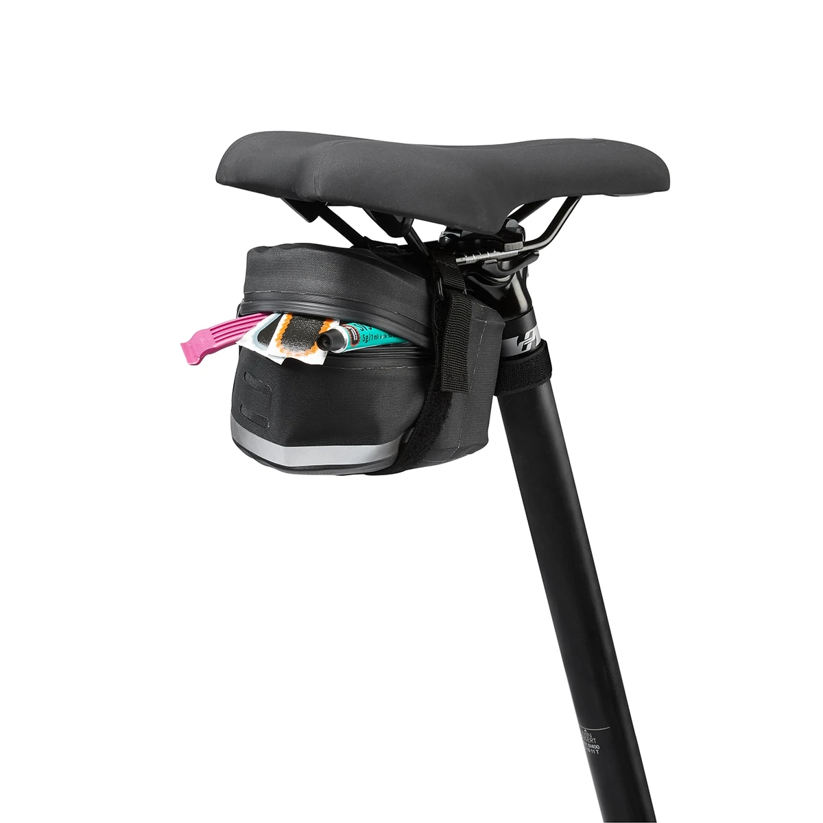 Size L is the medium version of this bag and offers a little more storage space for your repair kit, spare tube and most valued tools. This saddle bag also uses recycled polyamide ECONYL, saving valuable resources.